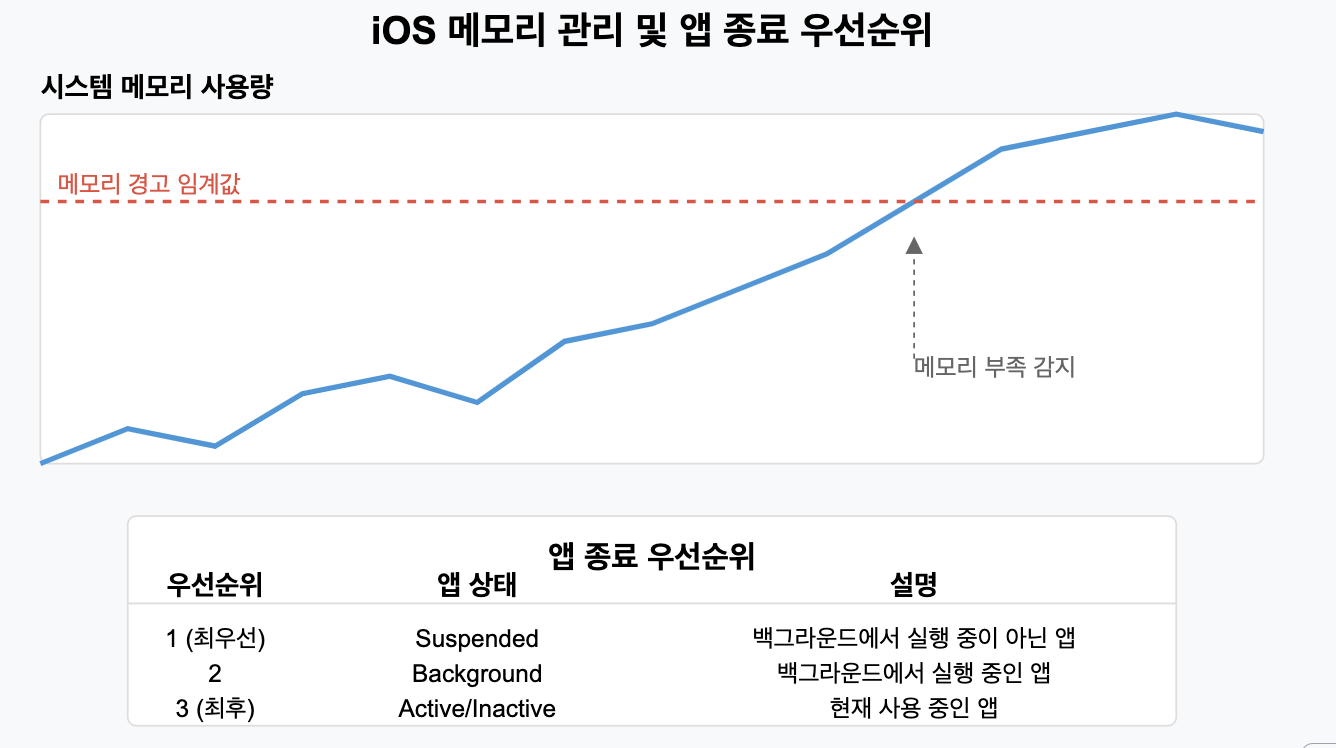- 메모리 압박 시: 시스템이 메모리 부족을 감지하면 백그라운드 앱부터 종료합니다.