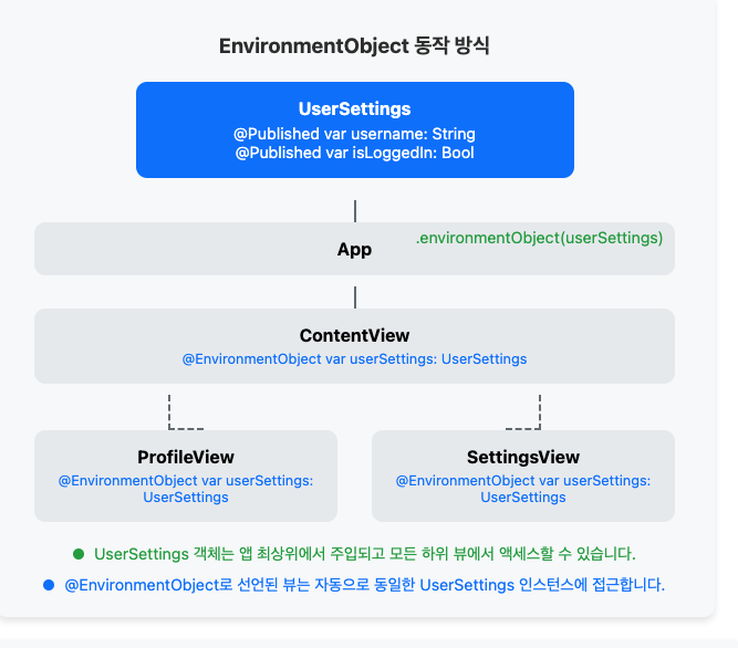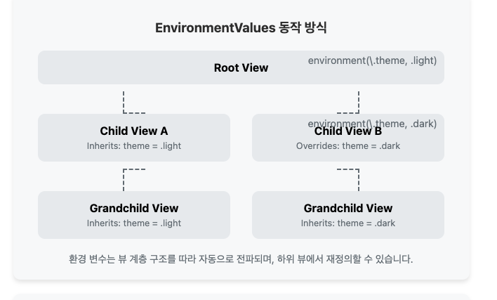 - 환경 변수는 뷰 계층 구조 전체에 걸쳐 값을 공유하는 데 사용되며, 명시적인 프로퍼티 전달 없이도 깊이 중첩된 뷰에서 접근할 수 있습니다.