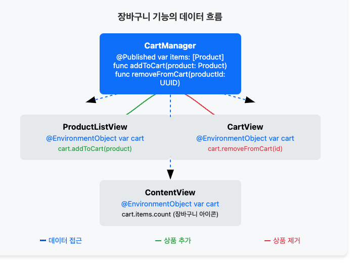 이 예제에서는 CartManager 환경 객체를 통해 상품 목록 뷰와 장바구니 뷰 간에 장바구니 상태를 공유합니다. 사용자가 상품을 장바구니에 추가하면 장바구니 아이콘의 카운터와 장바구니 뷰가 자동으로 업데이트됩니다.
