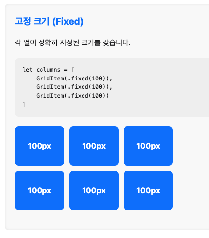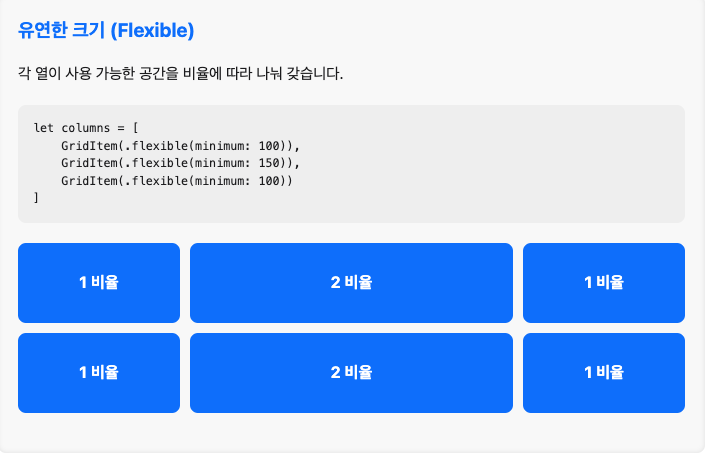 그리드 레이아웃을 설정하는 핵심은 GridItem 배열입니다. GridItem은 세 가지 사이징 옵션을 제공합니다: