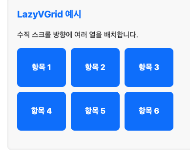 LazyVGrid: 수직 스크롤 방향에 격자 형태의 열을 배치합니다. LazyHGrid: 수평 스크롤 방향에 격자 형태의 행을 배치합니다.