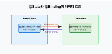 - 상위 뷰의 상태와 연결: @Binding은 상위 뷰의 @State 또는 다른 상태 소스와 연결됩니다.