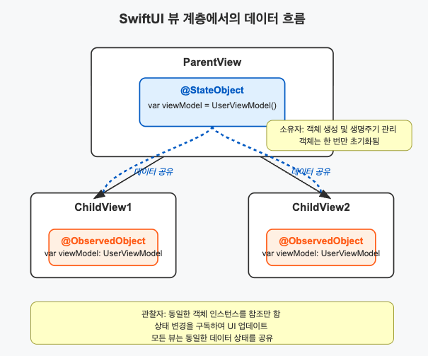 - @StateObject는 객체를 소유하고 뷰의 생명주기 동안 유지하며, 객체를 처음 생성하는 뷰에서 사용해야 합니다.