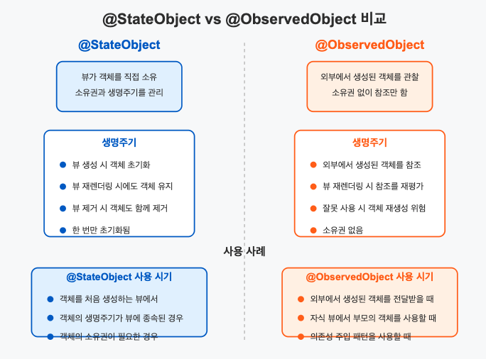 @StateObject와 @ObservedObject는 유사해 보이지만 중요한 차이점을 가지고 있습니다:
