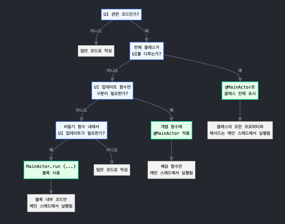 - 성능 고려: @MainActor로 표시된 코드는 모두 메인 스레드에서 실행됩니다. 오래 걸리는 작업은 메인 스레드를 차단하고 UI를 멈추게 할 수 있으므로, 시간이 많이 소요되는 작업은 다른 액터나 Task에서 처리해야 합니다.