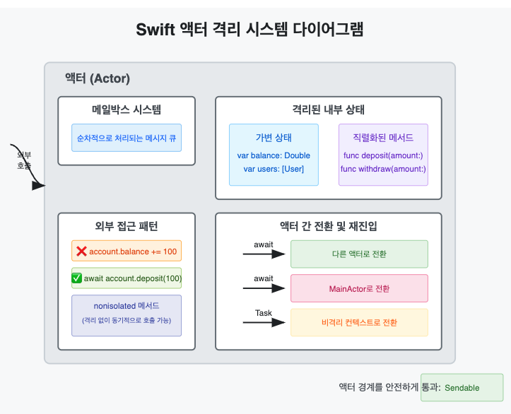 이 코드에서 balance 변수는 액터 내부에 격리되어 있습니다. 외부에서는 deposit, withdraw, 또는 checkBalance 메서드를 통해서만 접근할 수 있으며, 이러한 메서드 호출은 자동으로 직렬화됩니다.