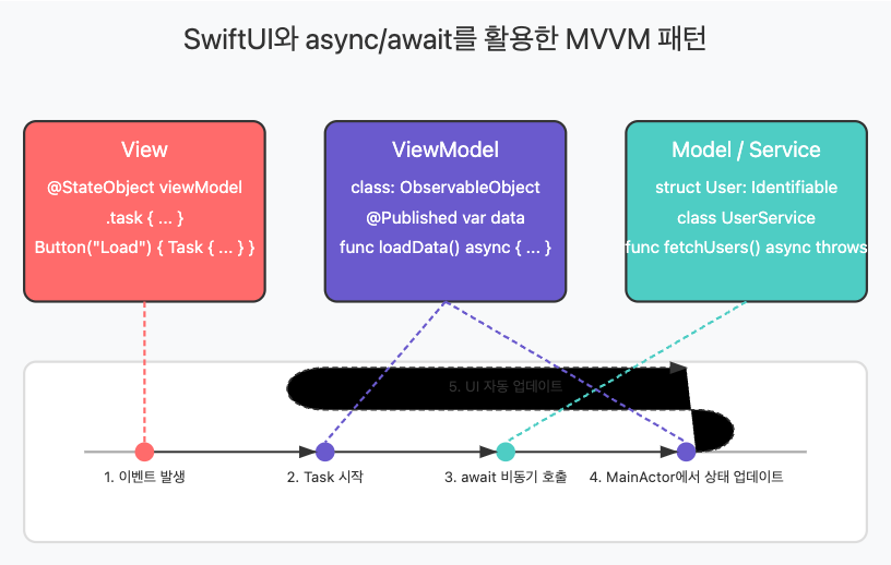 이 패턴은 비동기 작업의 다양한 상태(로딩, 에러, 성공)를 SwiftUI UI에 반영하는 기본적인 방법입니다. Task를 사용하여 비동기 함수를 호출하고, 상태 프로퍼티를 업데이트하여 UI 변경을 트리거합니다.