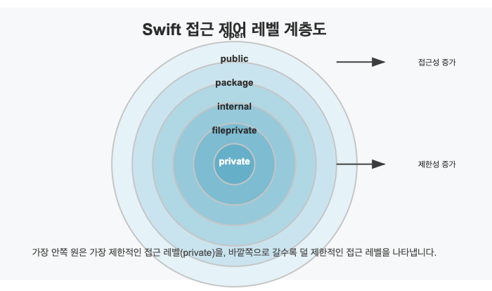 - 멤버의 기본 접근 레벨: 타입의 접근 레벨에 따라 멤버의 기본 접근 레벨이 결정됩니다.
